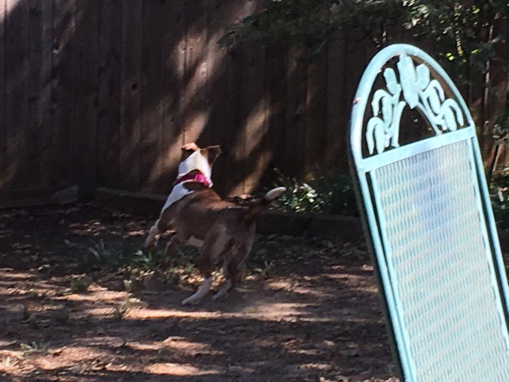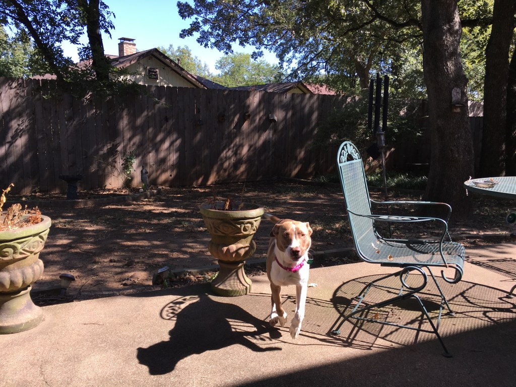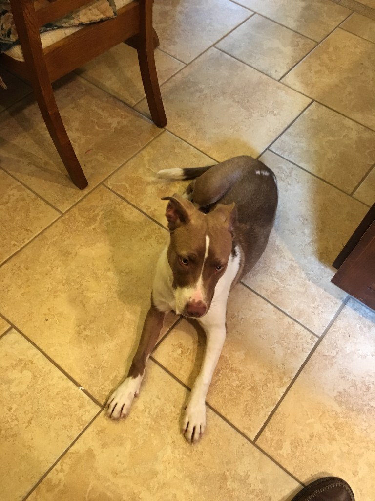 My wife and I rescued a one-year-old dog last week. She’s part AmStaff and a couple of friends whom I consider Dog Experts think she’s got some Rhodesian Ridgeback in her. We got her from the Hickory Creek Animal Shelter. The officer there told us that she was dropped off as a stray but felt it was truly a surrender; the dog really didn’t want to leave the family dropping her off.